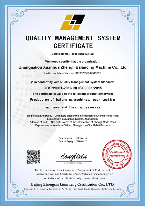 Zhangjiakou Xuanhua Zhengli Balancing Machine Company was established in 1999 in Xuanhua, a well-known industrial city in northern China that has developed into the country’s second-largest base for balancing machines and wear testing equipment. Our product range includes eight main series with more than thirty specifications of balancing machines, supported by the flexible ZL electronic measuring system. Besides manufacturing balancing equipment and wear testing systems, we provide training, maintenance, retrofitting, and system upgrade services to support customers in the long term. Up till now, we have worked with over 5300 clients, and our products have been exported to markets including Kazakhstan, Tunisia, North Korea, Russia, and Dubai, where they are recognized for their reliability and performance.